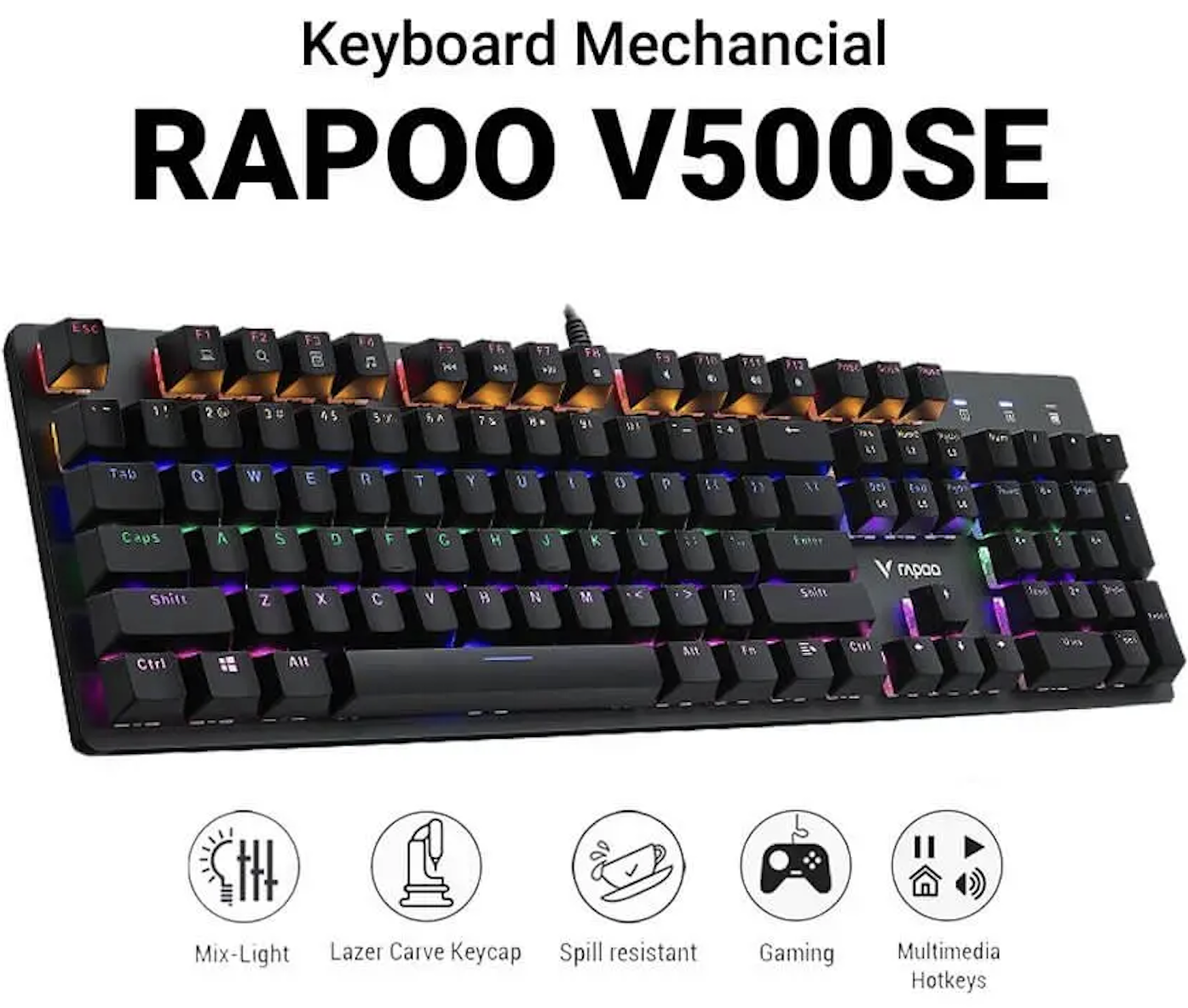 ►Rapoo V500SE là một bàn phím cơ có dây với kết nối USB, thiết kế hướng đến những người dùng yêu cầu sự chính xác và cảm giác gõ tốt hơn, đặc biệt là cho các game thủ và những người làm việc với văn bản nhiều. Bàn phím này nổi bật với các switch cơ học và các tính năng đặc biệt dành cho hiệu suất cao.