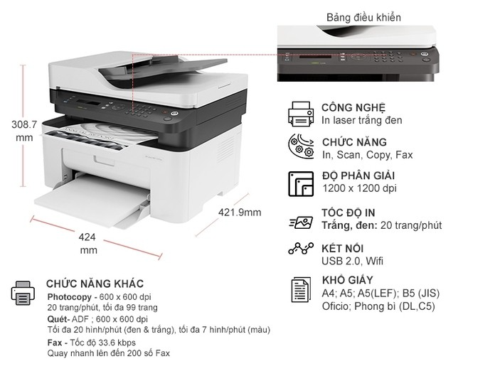 Tích hợp nhiều chức năng: In, sao chép, quét và fax, giúp thực hiện nhiều nhiệm vụ văn phòng với một thiết bị duy nhất, tiết kiệm không gian và chi phí.