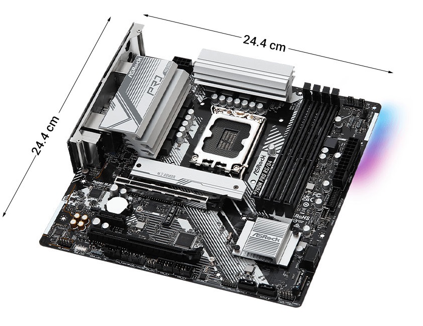 ASRock B760M Pro RS/D4 được thiết kế theo chuẩn Micro-ATX, phù hợp với nhiều loại thùng máy phổ biến hiện nay. Kích thước gọn gàng giúp người dùng dễ dàng lắp đặt và tối ưu không gian bên trong case.
