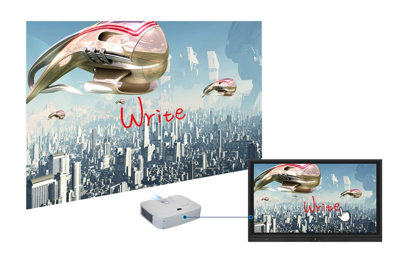 Có thể kết hợp ViewBoard® với máy chiếu ViewSonic và bộ HDBaseT HB10B để cho phép người thuyết trình phóng to nội dung hiển thị trên màn hình, giúp bài thuyết trình tại địa điểm lớn trở nên hấp dẫn hơn.