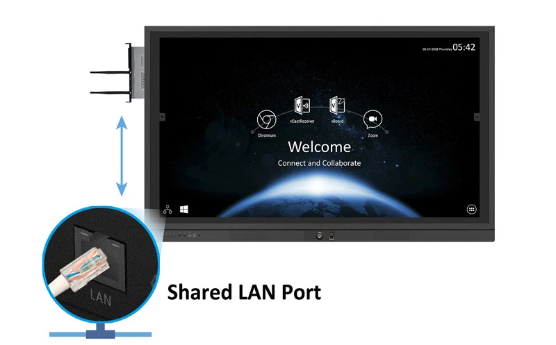 Cổng mạng LAN tích hợp của ViewBoard® giúp liên kết mạng được kết nối với PC có khe cắm để kết nối dễ dàng. Nhờ vậy, bạn chỉ cần lắp cáp Internet một lần thay vì chuyển đổi giữa các PC nhúng và có khe cắm.