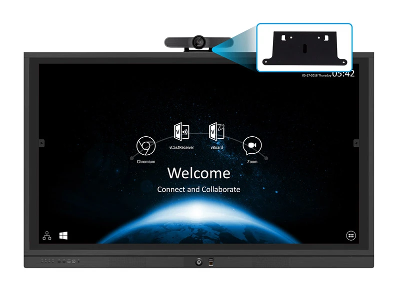 ViewBoard đi kèm giá gắn webcam tương thích Logitech và MeetUP dọc theo đầu bảng để đính kèm webcam hội nghị video tiện nghi.