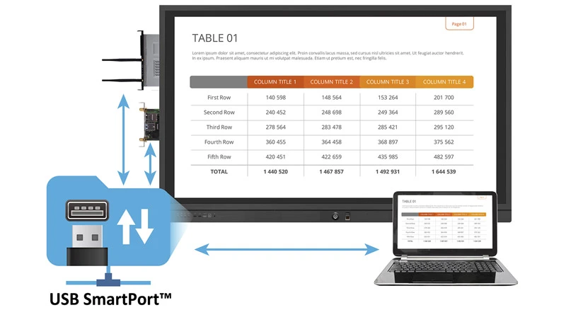 USB SmartPort™ cho phép truyền dữ liệu USB giữa các cổng USB phía trước của ViewBoard® và các cổng USB của PC có khe cắm và máy tính xách tay được kết nối. Nhờ thế, bạn có thể đồng bộ hóa kết nối USB giữa các thiết bị của mình một cách nhanh chóng và dễ dàng mà không cần đổi USB.