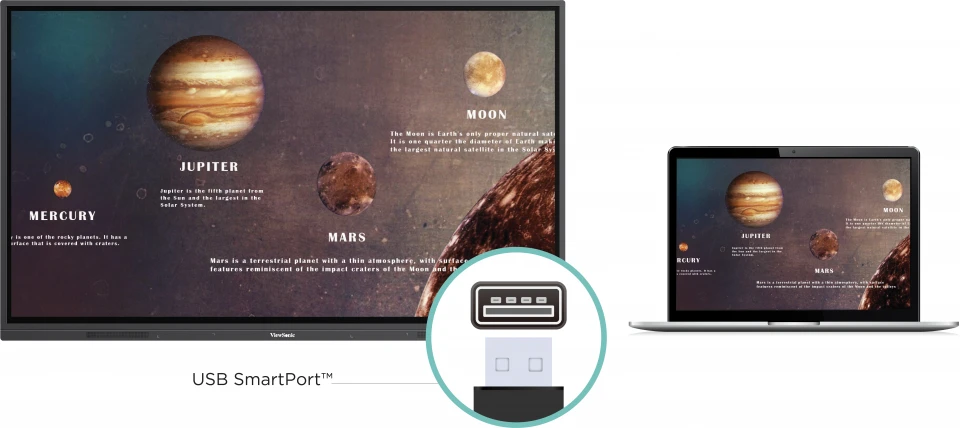 Dễ dàng kết nối PC bên trong và bên ngoài bất kỳ lúc nào bằng USB SmartPort ở mặt trước. Đồng bộ hóa nhanh chóng thiết bị của bạn với ViewBoard mà không cần trao đổi USB truyền thống.