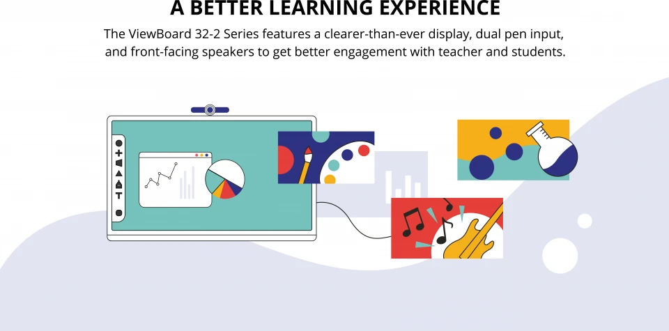 Được thiết kế để chia sẻ ý tưởng và cộng tác giữa các học sinh, dòng ViewBoard® 32-2 được trang bị tấm nền cảm ứng 20 điểm và chức năng bút kép. Tự động khớp màu sắc và độ dày của bút mà không cần chuyển đổi chế độ.