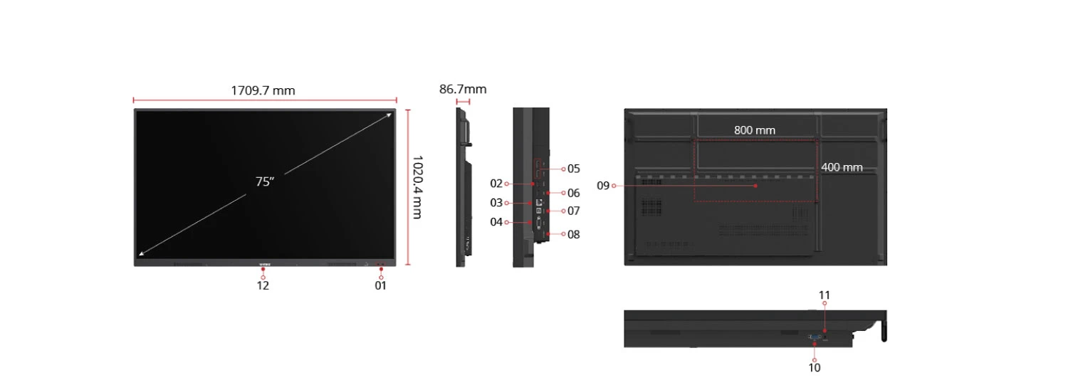 1. Power cord / 2.Remote control with AAA battery / 3.USB touch cable / 4. Touch pen x 2 / 5. Quick Start Guide + Compliance statement / 6. RS232 adapter / 7. Screw x 4 ( wall mount 4) / 8. HDMI cable / 9. Clamp x5 / |