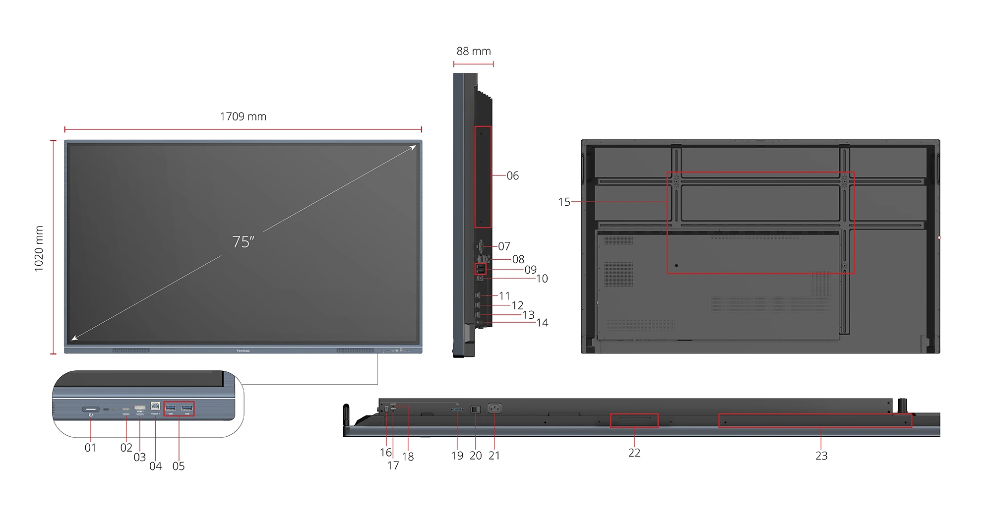 1. 3m power cord by ship area 2. Remote control with AAA battery 3. 3m touch USB cable 4. Touch pen x 2 (VB-PEN-009) 5. Quick Start Guide + Compliance statement 6. RS232 adapter 7. Clamp x 5 8. Camera Plate 9. Screw x 8 (camera 2+2, wall mount 4) 10. HDMI cable 3m |