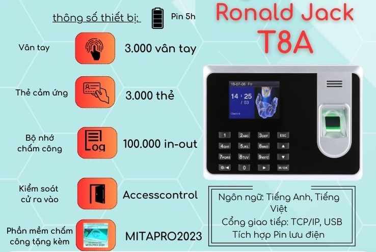 ► Máy chấm công Ronald Jack T8A là một trong những dòng máy chấm công vân tay phổ biến, được thiết kế dành cho các doanh nghiệp vừa và nhỏ. Máy này không chỉ cung cấp chức năng chấm công chính xác mà còn có giao diện thân thiện, dễ sử dụng, giúp quản lý thời gian làm việc của nhân viên một cách hiệu quả.