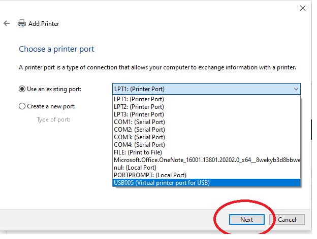 Tới đây bạn cần chọn cổng USB cho máy in xong nhấn NEXT