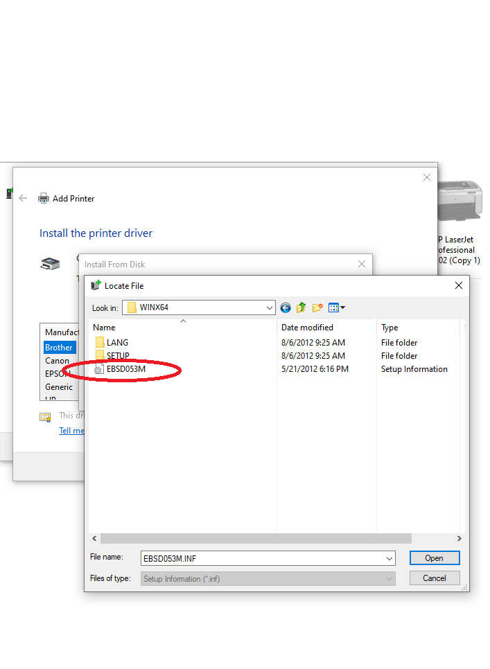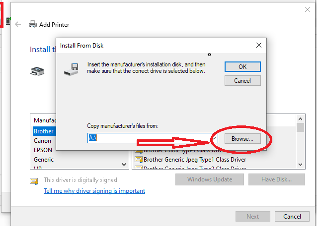 chọn have disk ⇒ Browse⇒ tìm đến đường dẫn DRIVER MAY IN mà bạn vừa Tải về