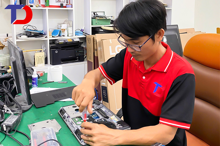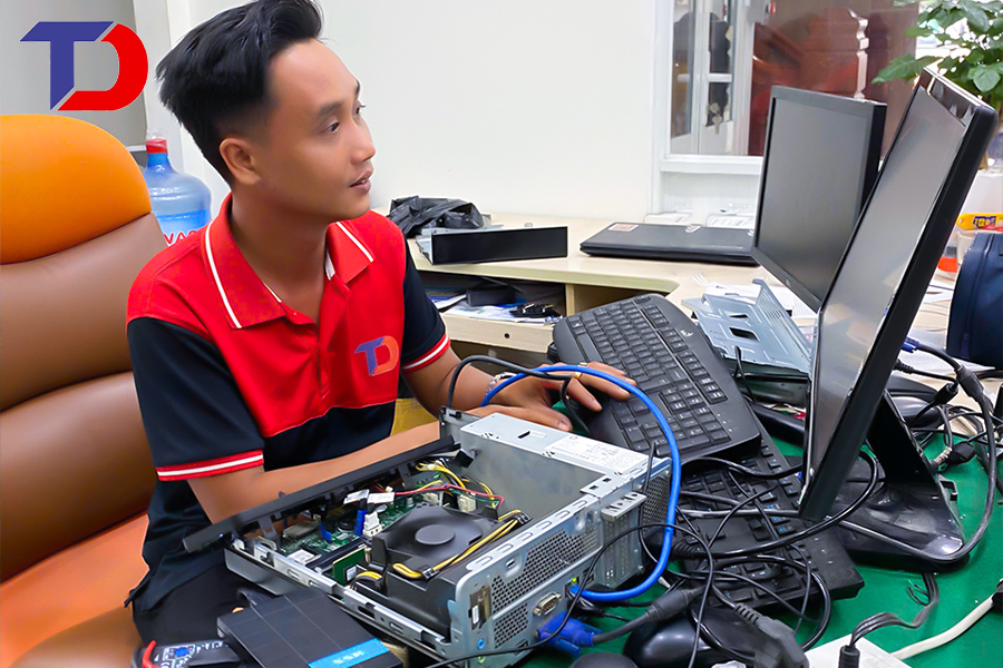 Kỹ thuật viên Tâm Đức Tech kiểm tra và khắc phục sự cố máy tính khách hàng