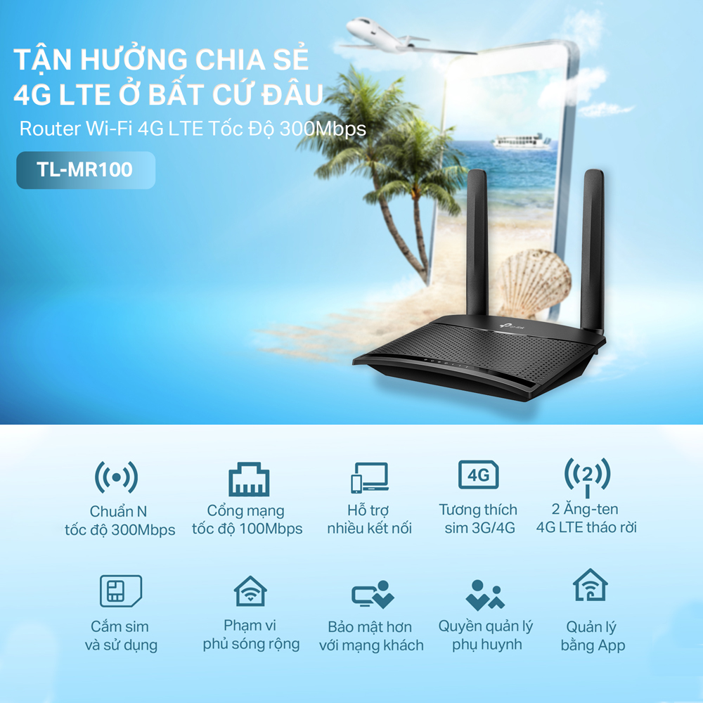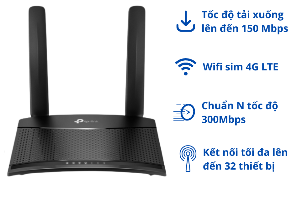 ►TP-LINK TL-MR100 là một router WiFi 4G LTE cung cấp giải pháp kết nối mạng không dây cho các khu vực không có sẵn kết nối cáp hoặc dây mạng. Với khả năng hỗ trợ mạng 4G LTE, router này giúp cung cấp kết nối Internet nhanh chóng và ổn định thông qua mạng di động.